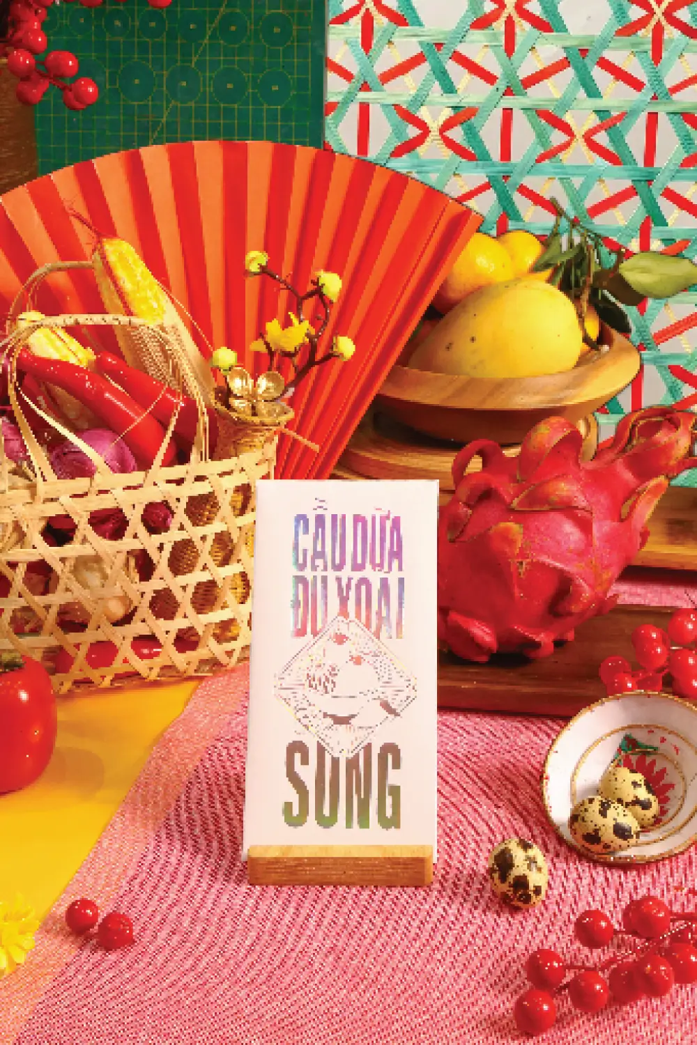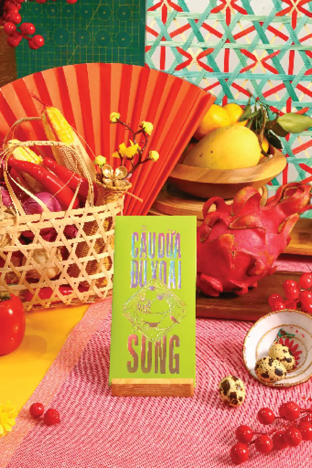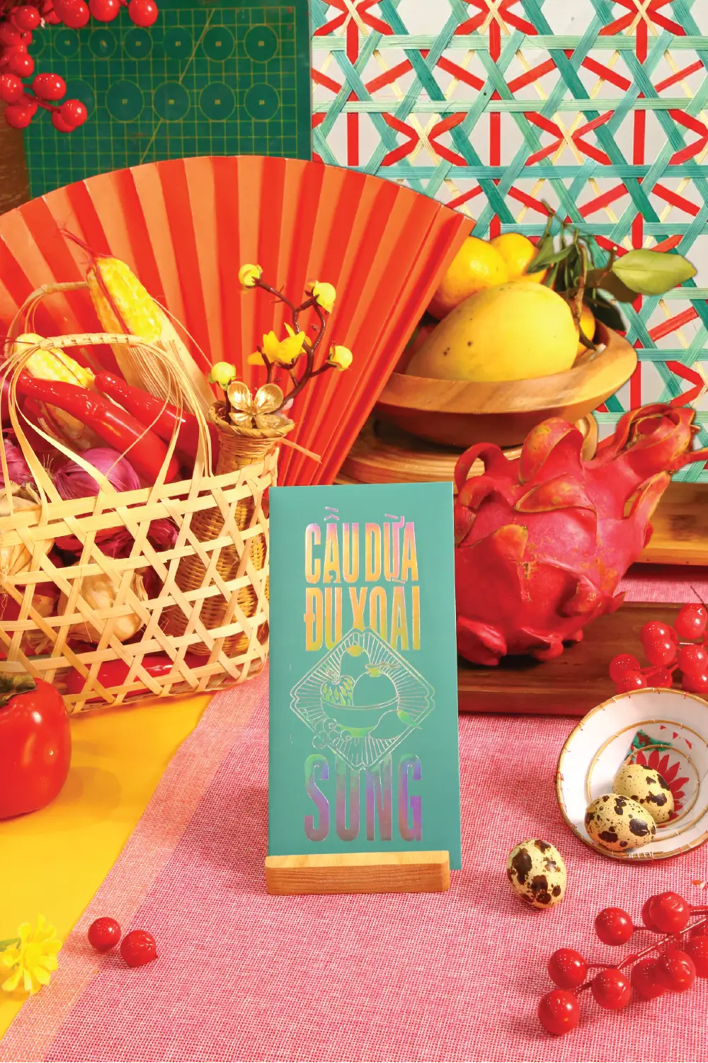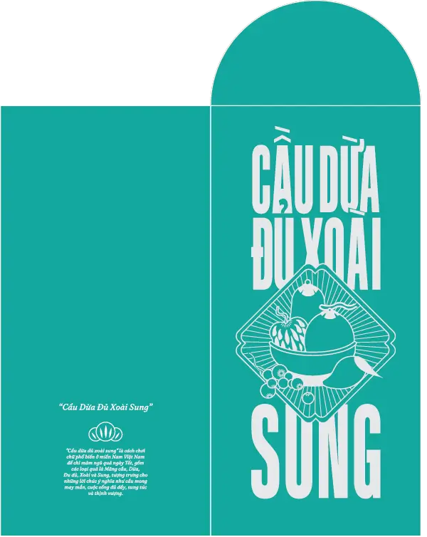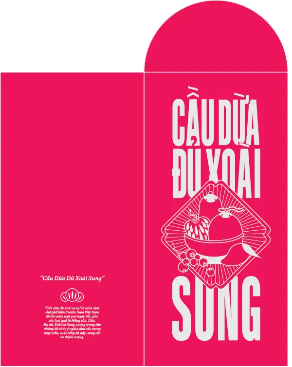 “Cầu Sung Dừa Đủ Xoài” is a popular Southern Vietnamese wordplay referring to the traditional five-fruit tray displayed during the Lunar New Year (Tết). The tray typically includes custard apple (mãng cầu), coconut (dừa), papaya (đu đủ), mango (xoài), and fig (sung). Together, these fruits embody heartfelt wishes for good fortune, abundance, prosperity, and a fulfilling life.