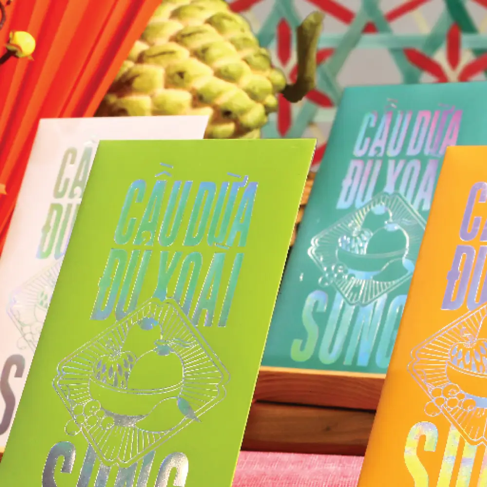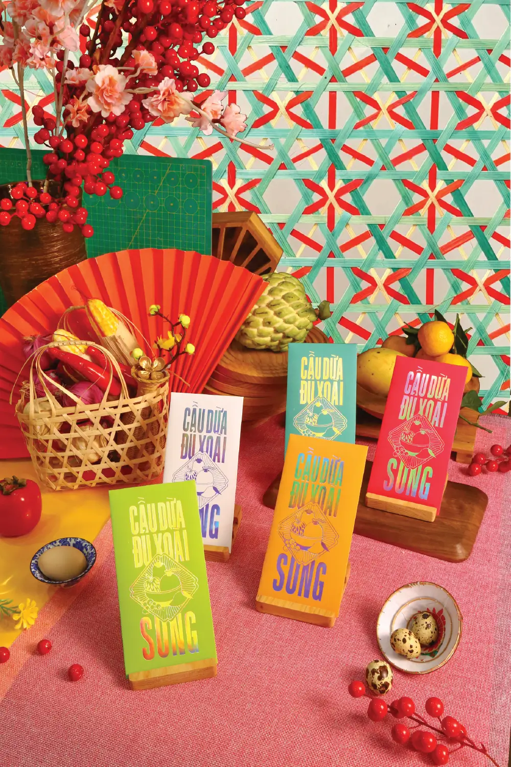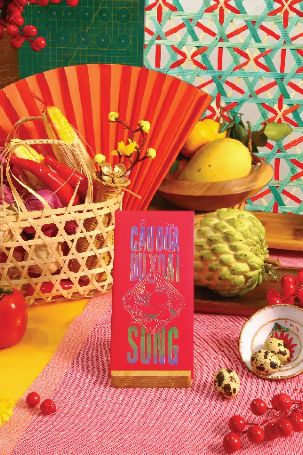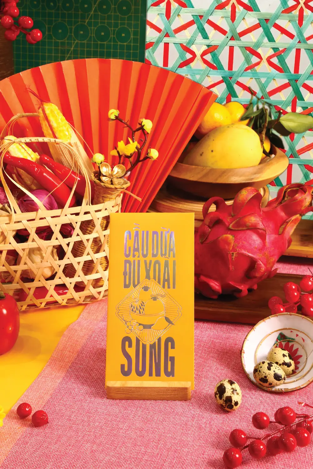 “Cầu Sung Dừa Đủ Xoài” is a popular Southern Vietnamese wordplay referring to the traditional five-fruit tray displayed during the Lunar New Year (Tết). The tray typically includes custard apple (mãng cầu), coconut (dừa), papaya (đu đủ), mango (xoài), and fig (sung). Together, these fruits embody heartfelt wishes for good fortune, abundance, prosperity, and a fulfilling life.